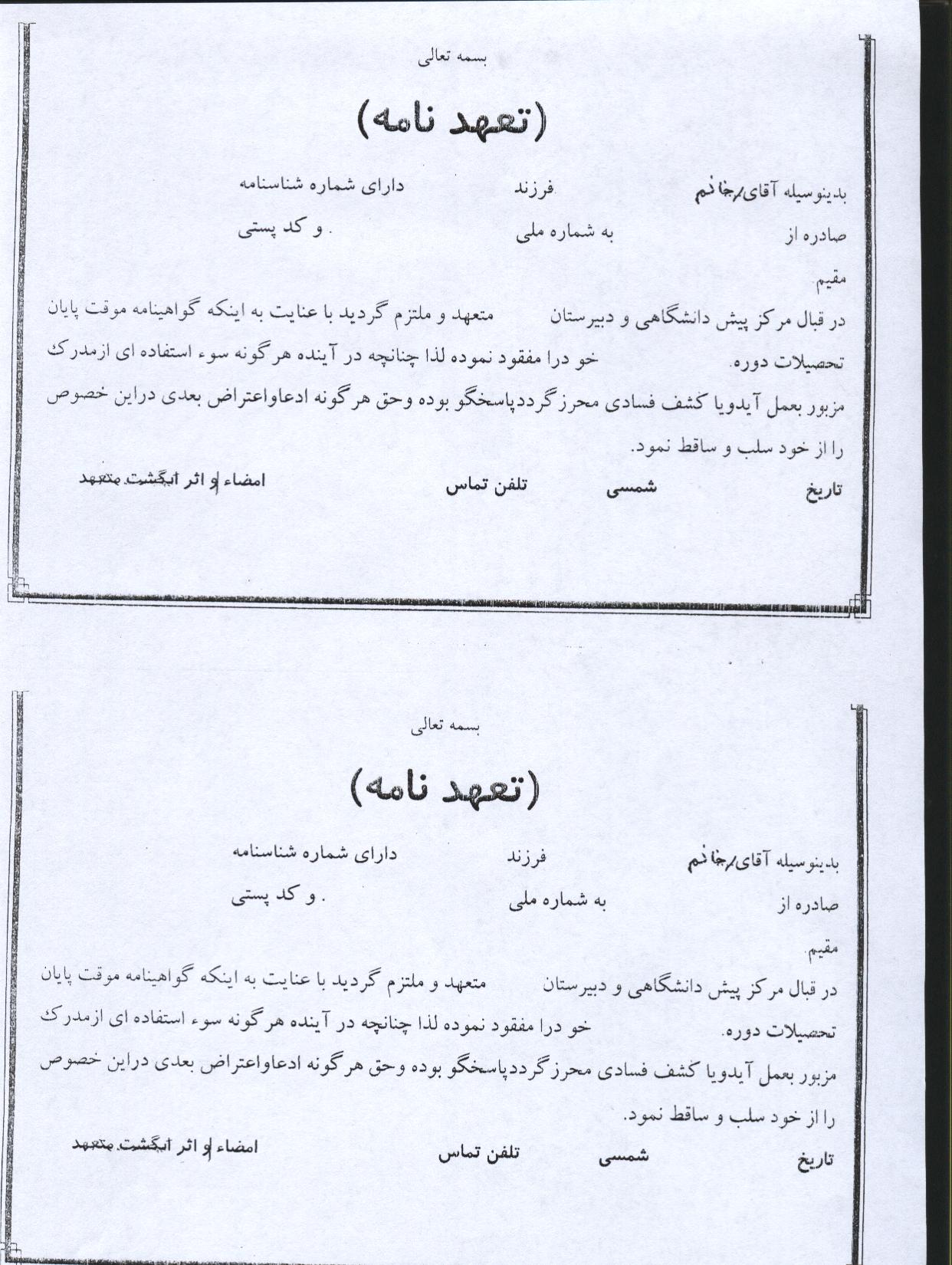 فرم تعهد نامه برای اخذ گواهینامه اصلی پایان تحصیلات :
